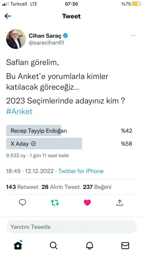 AK Parti’de geçmiş seçimlerde milletvekilli aday adaylığı başvuruları yapan Cihan Saraç, Twitter hesabından bir anket düzenledi.