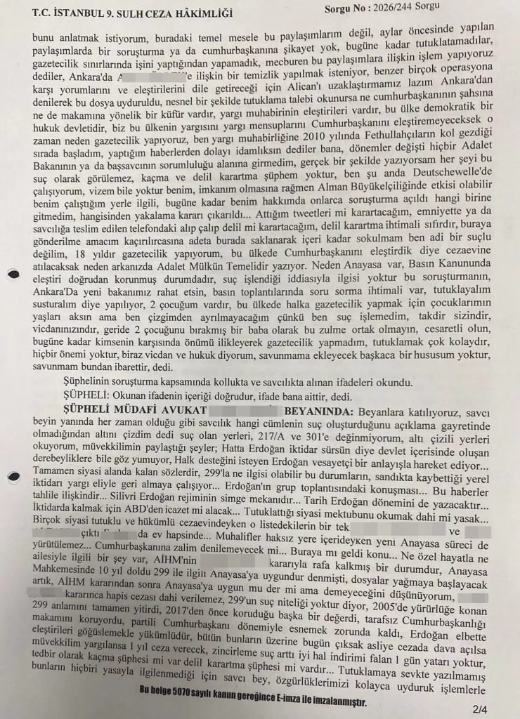 “Cumhurbaşkanına alenen hakaret”, “halkı yanıltıcı bilgiyi alenen yayma” ve “devletin kurumlarını aşağılama” iddiasıyla gözaltına alınan gazeteci Alican Uludağ‘ın savcılık ifadesi sona erdi.