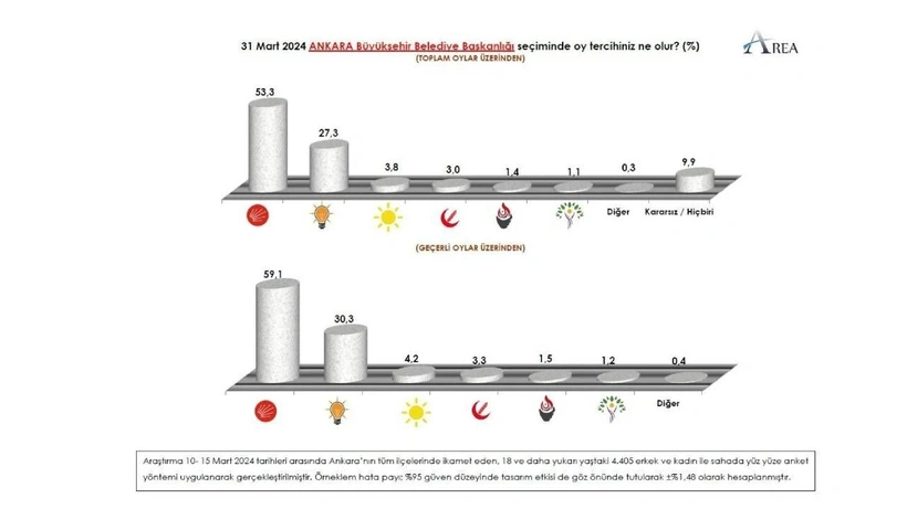 10- 15 Mart 2024 tarihleri arasında Ankara’nın tüm ilçelerinde ikamet eden, 18 ve daha yukarı yaştaki 4 bin 405 kişiyle sahada yüz yüze anket yöntemi uygulanarak gerçekleştirilen ankette, katılımcılara “31 Mart 2024 Ankara Büyükşehir Belediye Başkanlığı seçiminde oy tercihiniz ne olur?” sorusu yöneltildi.