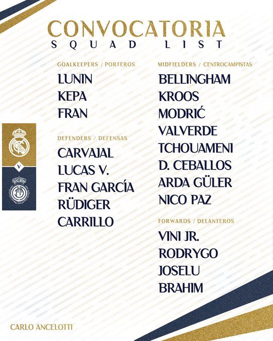 Real Madrid, 3 Ocak Çarşamba günü kendi sahasında oynayacağı Mallorca maçının kamp kadrosunu duyurdu.