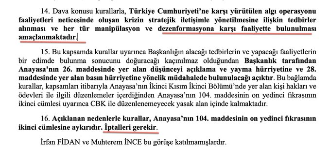 “Anayasa Mahkemesi, 27/12/2023 tarihinde E.2020/88 numaralı dosyada, (66) numaralı Cumhurbaşkanlığı Kararnamesi’nin 5. maddesiyle (14) numaralı İletişim Başkanlığı Teşkilatı Hakkında Cumhurbaşkanlığı Kararnamesi’ne eklenen 6/A maddesinin (c) ve (ç) bentlerinin Anayasa’ya aykırı olduğuna ve iptaline karar vermiştir.”