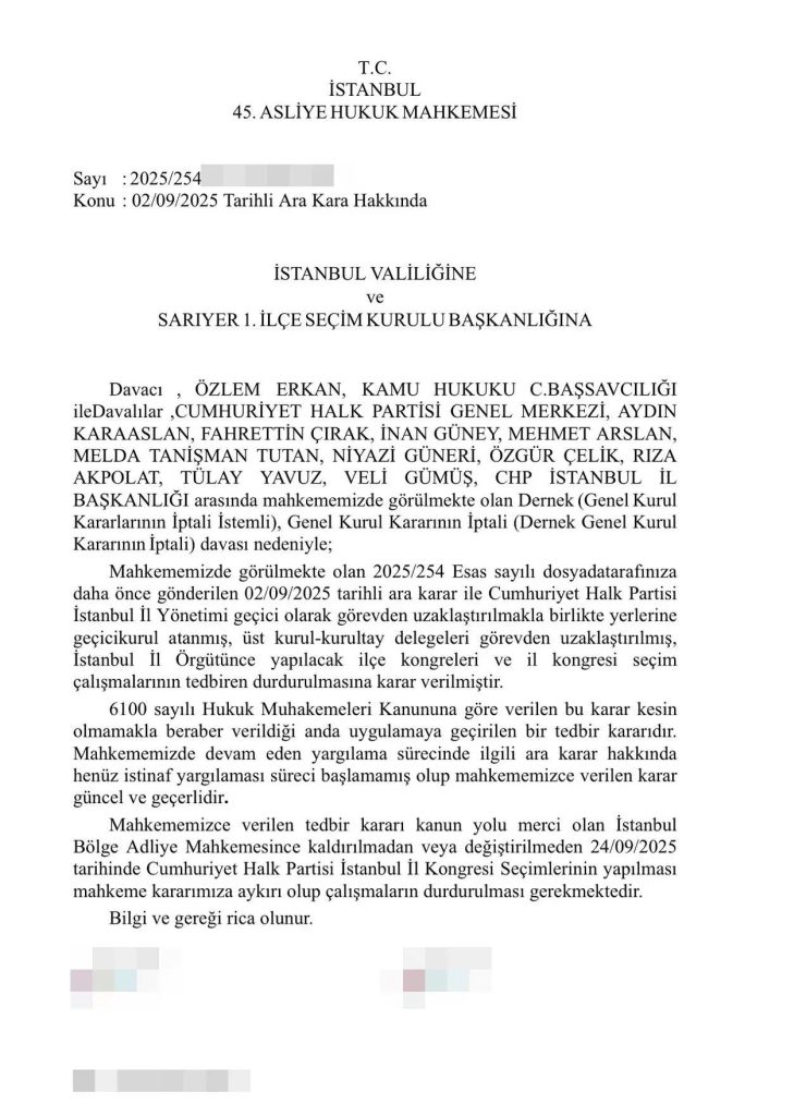“Mahkememizde görülmekte olan 2025/254 Esas sayılı dosyada tarafınıza daha önce gönderilen 02/09/2025 tarihli ara karar ile Cumhuriyet Halk Partisi İstanbul İl Yönetimi geçici olarak görevden uzaklaştırılmakla birlikte yerlerine geçici kurul atanmış, üst kurul-kurultay delegeleri görevden uzaklaştırılmış, İstanbul İl Örgütünce yapılacak ilçe kongreleri ve il kongresi seçim çalışmalarının tedbiren durdurulmasına karar verilmiştir.