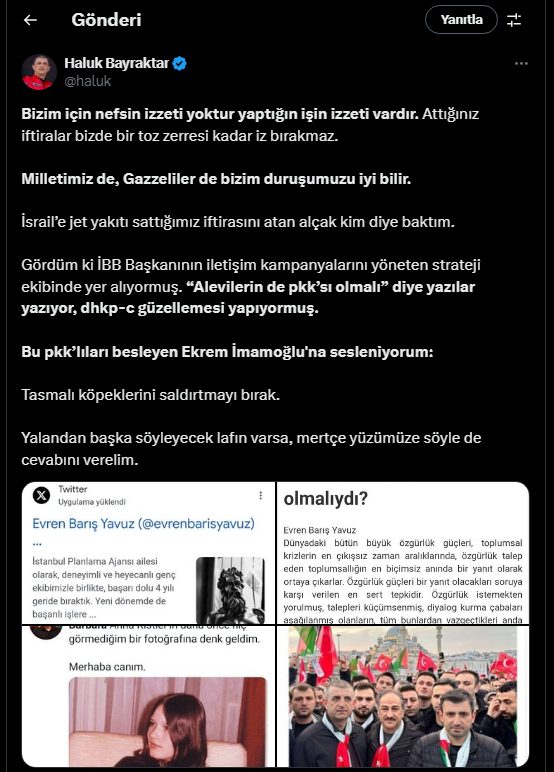 Geçtiğimiz Nisan ayında sosyal medya platformu X üzerinden yaptığı bir paylaşımda Haluk Bayraktar, İmamoğlu’nu ağır ifadelerle eleştirmişti.