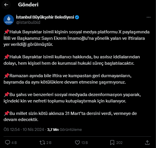Bayraktar’ın paylaşımı sonrası İBB tarafından yapılan açıklamada, paylaşımın iftira içerdiği ve bu nedenle hukuki sürecin başlatıldığı belirtildi. Açıklamada, “Ramazan ayında bile iftira ve kumpastan geri durmayanların bayramda da aynı kötülüklere devam etmesine şaşırmıyoruz,” ifadelerine yer verildi. Ardından da Haluk Bayraktar hakkında hakaretten tazminat davası açıldı.