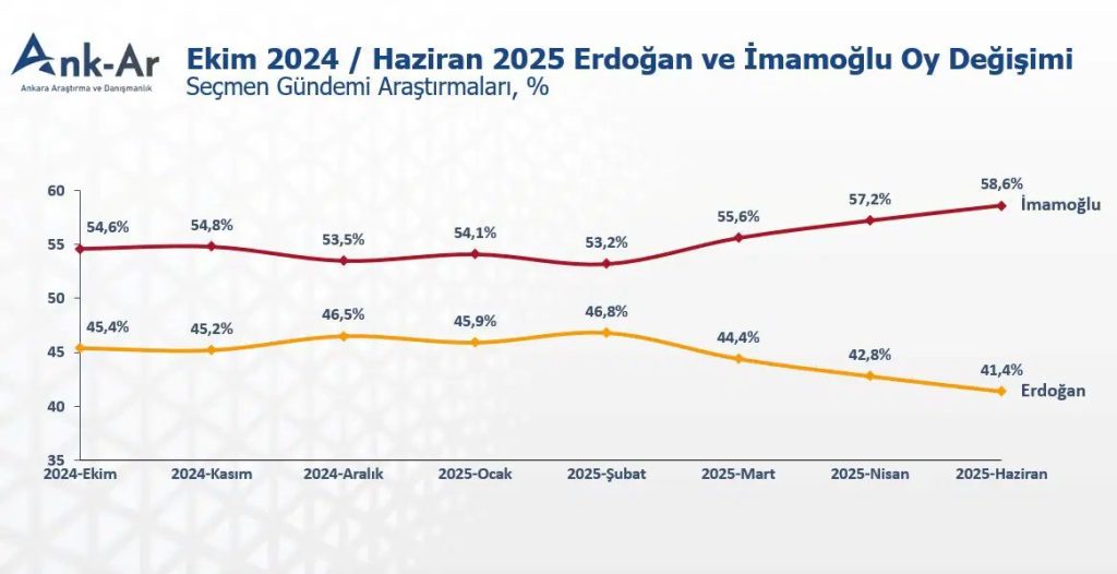 2025 Haziran ayı itibariyle İmamoğlu yüzde 58,6 oy alırken, Erdoğan yüzde 41,4’te kaldı.
