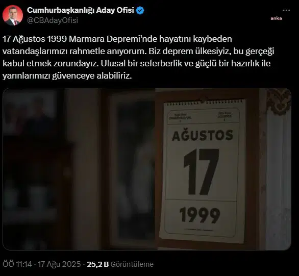 Silivri Cezaevi’nde tutuklu bulunan İstanbul Büyükşehir Belediye (İBB) Başkanı ve CHP’nin Cumhurbaşkanı Adayı Ekrem İmamoğlu, Cumhurbaşkanlığı Aday Ofisi resmi sosyal medya hesabından yaptığı açıklamada, “17 Ağustos 1999 Marmara Depremi’nde hayatını kaybeden vatandaşlarımızı rahmetle anıyorum. Biz deprem ülkesiyiz, bu gerçeği kabul etmek zorundayız. Ulusal bir seferberlik ve güçlü bir hazırlık ile yarınlarımızı güvenceye alabiliriz” ifadesini kullandı.