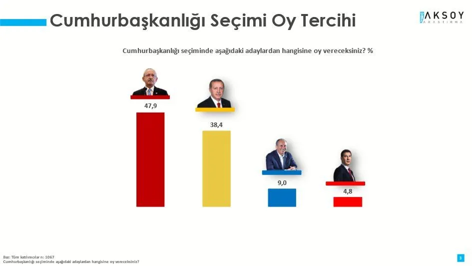 Aksoy Araştırma Şirketi, 14 Mayıs’ta yapılacak seçimlere 26 gün kalmışken dikkat çeken anketin sonuçlarını paylaştı.