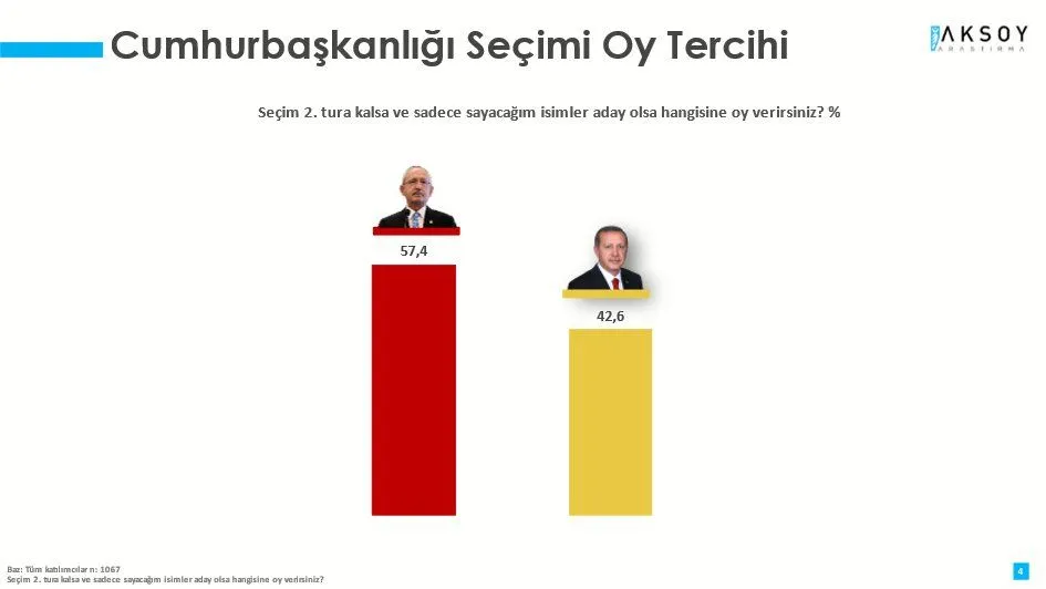 “Seçim ikinci tura kalırsa ve sadece sayacağım aday olsa hangisine oy verirsiniz?” sorusuna ise katılıcımların yüzde 57.4’ü “Kemal Kılıçdaroğlu”, yüzde 42.6’sı “Recep Tayyip Erdoğan” dedi.