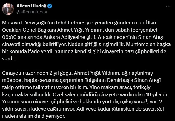 “Müsavat Dervişoğlu’nu tehdit etmesiyle yeniden gündem olan Ülkü Ocakları Genel Başkanı Ahmet Yiğit Yıldırım, dün sabah (perşembe) 09:00 sıralarında Ankara Adliyesine gitti. Ancak nedeninin Sinan Ateş cinayeti olmadığı belirtiliyor. Neden gittiği sır şimdilik. Muhtemelen başka bir konuda ifade verdi. Yanında kendisi gibi cinayetin bazı şüphelileri de vardı.