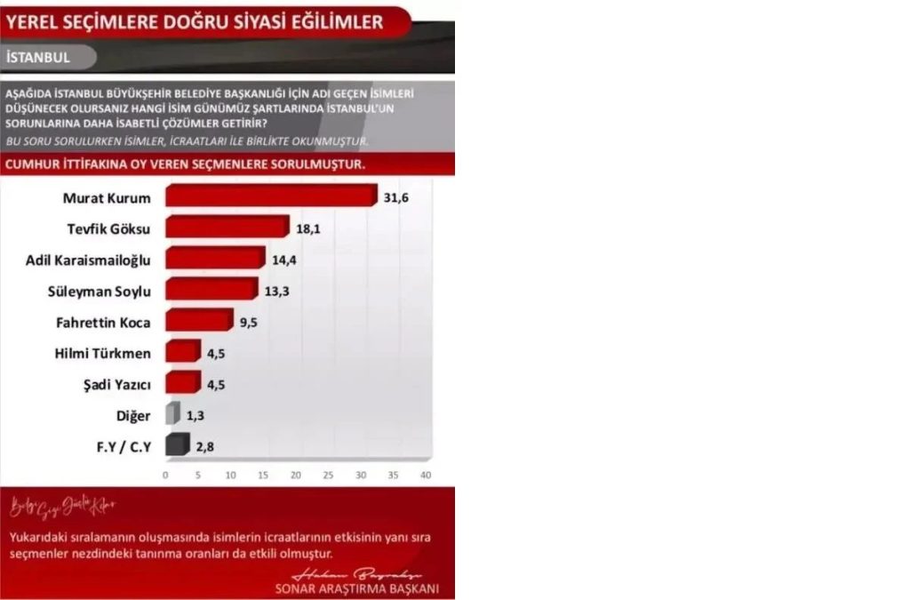 Sonar Araştırma, 16-25 Ekim tarihleri arasında 25 il ve 88 ilçede 4 bin 221 kişiyle anket çalışması yaptı. İstanbul için Ekrem İmamoğlu açık ara ilk sırada çıkarken, AKP’nin olası adaylarına desteğin düşük çıkması dikkat çekti.