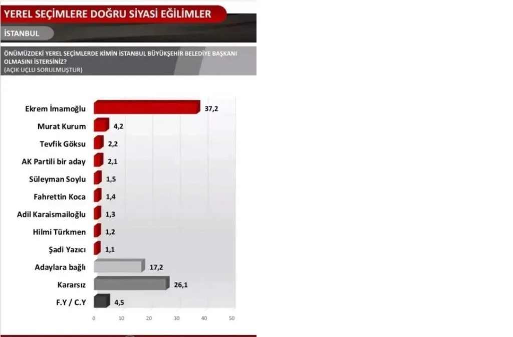 “Önümüzdeki yerel seçimlerde kimin İstanbul Büyükşehir Belediye Başkanı olmasını istersiniz?” sorusuna verilen yanıtlara göre olası adayların oy oranları şöyle: