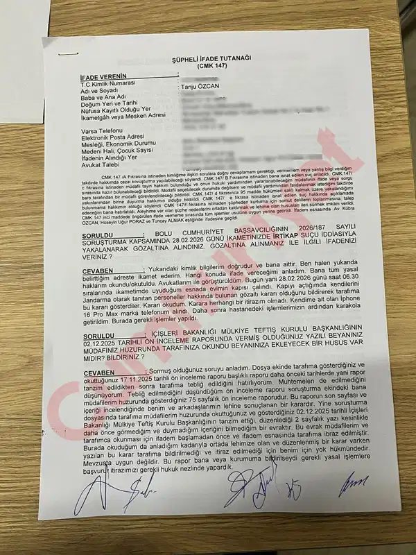 Bolu Cumhuriyet Başsavcılığınca yürütülen soruşturma kapsamında 28 Şubat sabahı gözaltına alınan Özcan’ın emniyetteki ifade tutanağına göre, saat 06.30 sıralarında ikametinde gözaltına alındığını, gözaltı kararını okuduğunu ve herhangi bir itirazda bulunmadığını söyledi. Özcan, işlemler sırasında cep telefonuna el konulduğunu, ardından hastane kontrolü sonrası karakola götürüldüğünü anlattı.