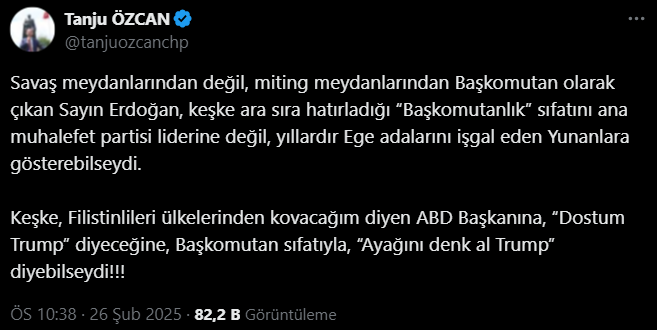 ABD Başkanı Donald Trump’ın Filistinlileri Gazze’den kovma çabasında olduğunu hatırlatan Özcan, “Sayın Erdoğan keşke ABD Başkanı’na, ‘Dostum Trump’ diyeceğine, Başkomutan sıfatıyla, ‘Ayağını denk al Trump’ diyebilseydi” dedi.